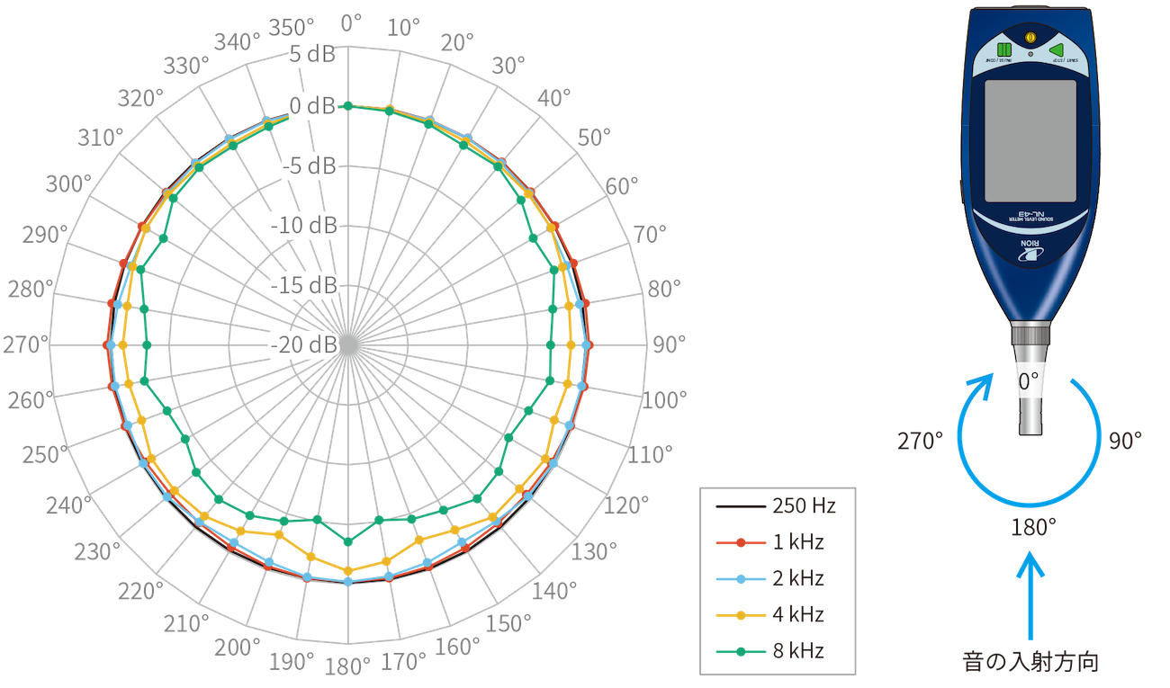 NL-43/NL-53で使用しているエレクトレットコンデンサマイクロホンは圧力型であるため本来全指向性(無指向性)ですが、高い周波数においては構造に起因する回折効果やくぼみ効果などのために指向性を持つようになります。