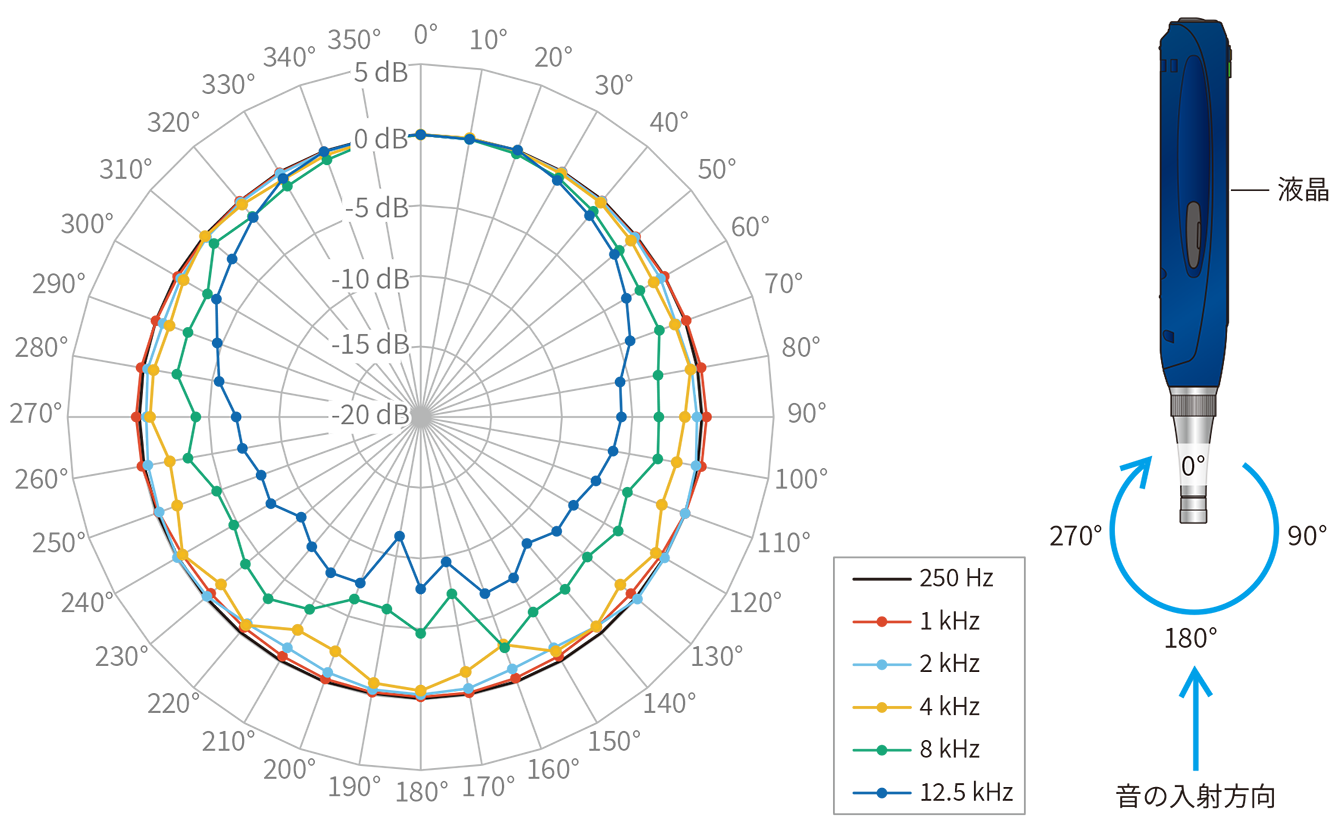 NL-63で使用しているエレクトレットコンデンサマイクロホンは圧力型であるため本来全指向性(無指向性)ですが、高い周波数においては構造に起因する回折効果やくぼみ効果などのために指向性を持つようになります。