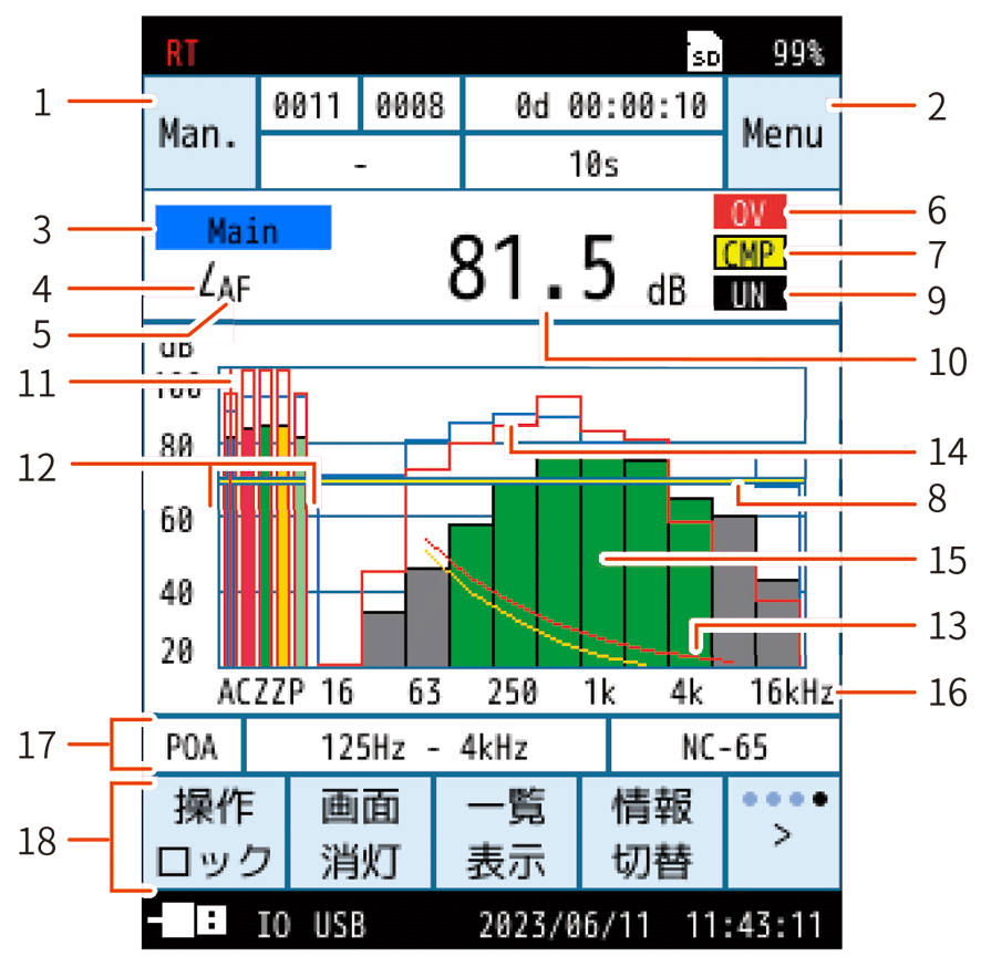 | 4 | 測定量 | カーソルで選択しているグラフの測定量を表示します。 | 5 | 周波数重み付け特性 |